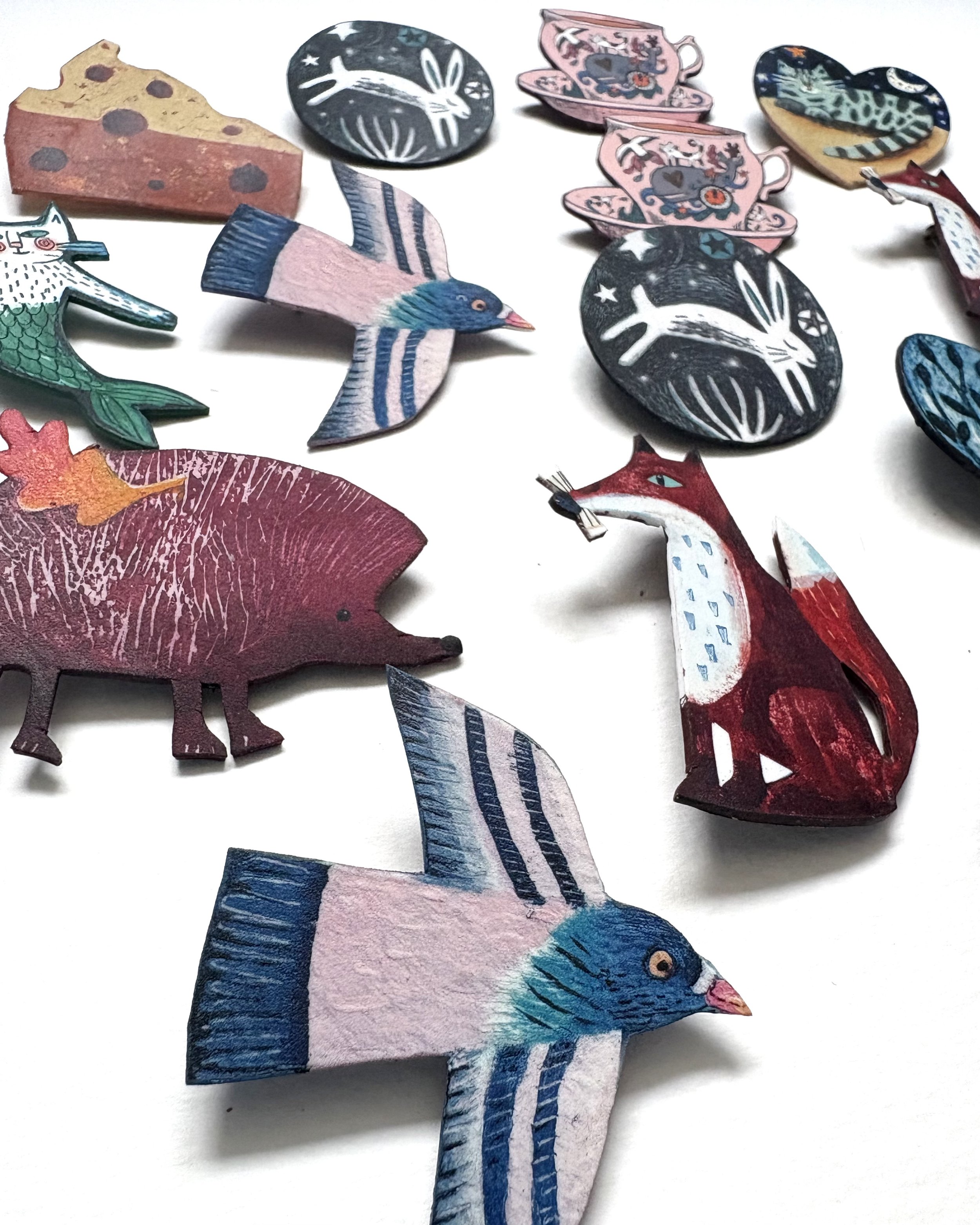My website shop is filling up with things to buy for Christmas and beyond. It always contains my main ranges of digital and giclee prints, cards and original artworks, but I have added a whole new range of these illustrated brooches and new ‘Magic Animal’ cards and artworks too. You can find my shop by clicking on the Shop section in the website menu above.