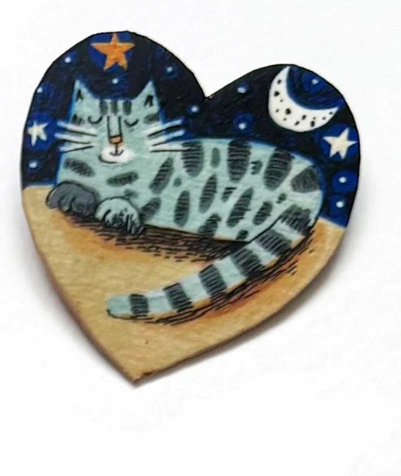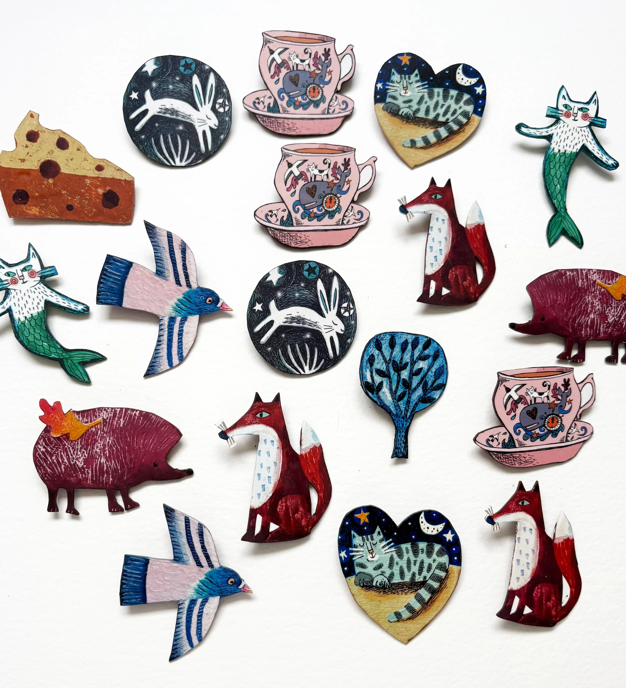 These brooches are made from shrink plastic of elements and characters from my illustrated world. I hand paint the sides and back and acrylic varnish them for waterproofing and durability.
