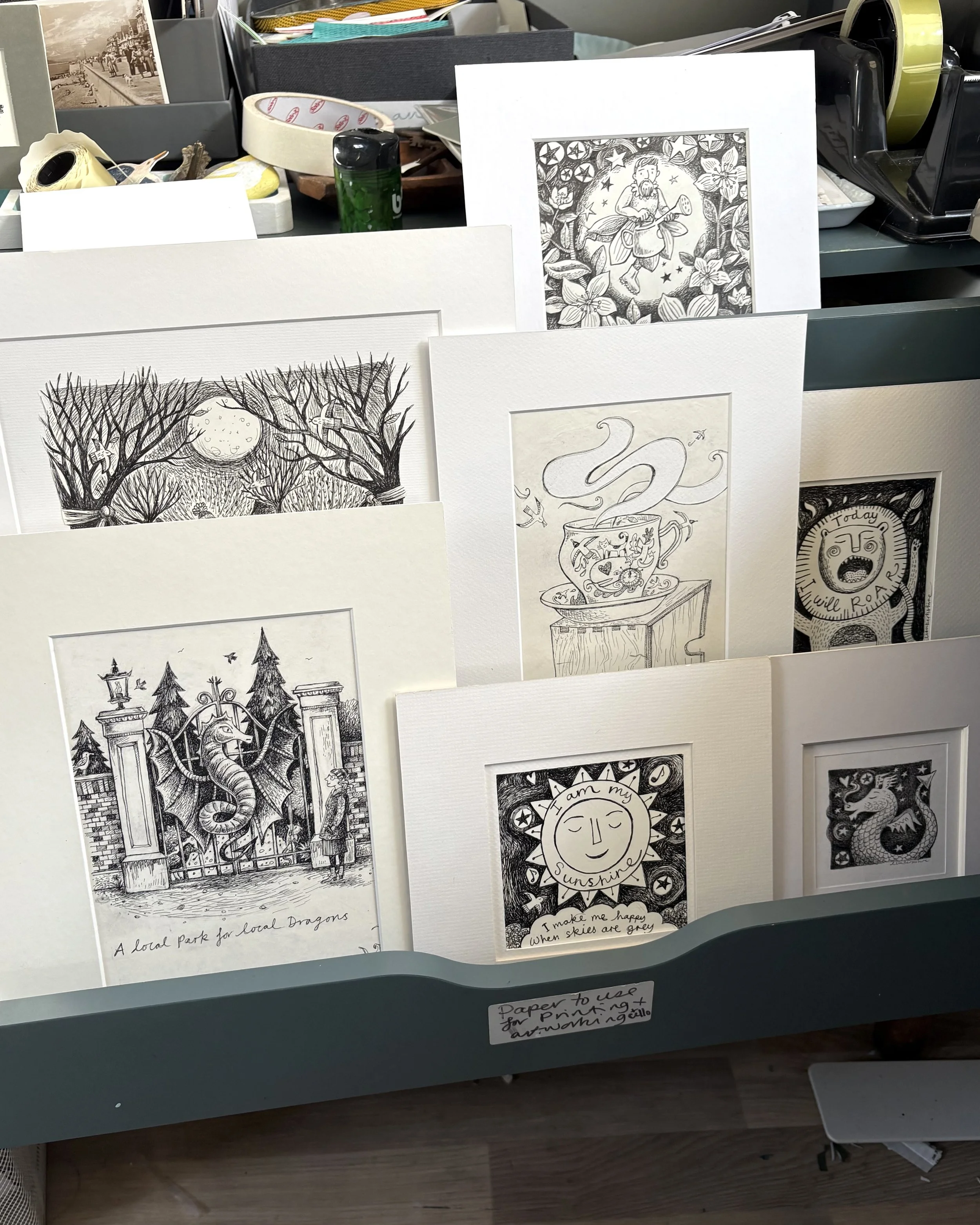Original pen line illustration 'Today I will Roar!' in an 8x8 inch mount
